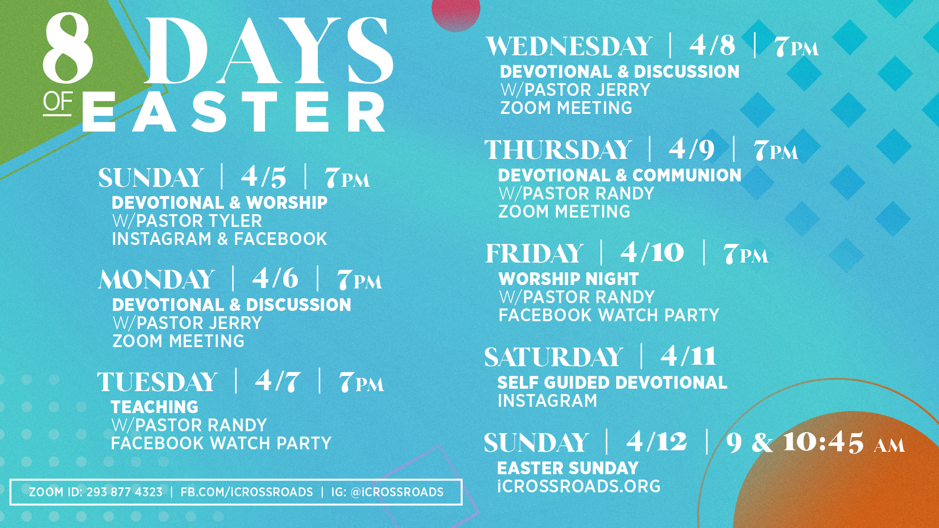 Prior to Easter Sunday, we had eight days of community building events that we promoted through social media, and some of which were hosted live on Facebook or Instagram.