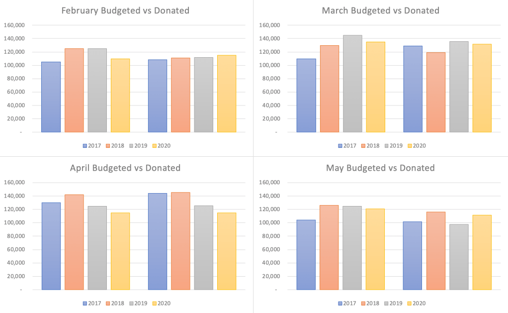 Thanks to these efforts, we’ve been able to do not just better than anticipated, but generally comparable to previous years. These are the amounts for the period in and around COVID-19. These represent the budgeted money vs. the donated money broken up by month and then again by year.